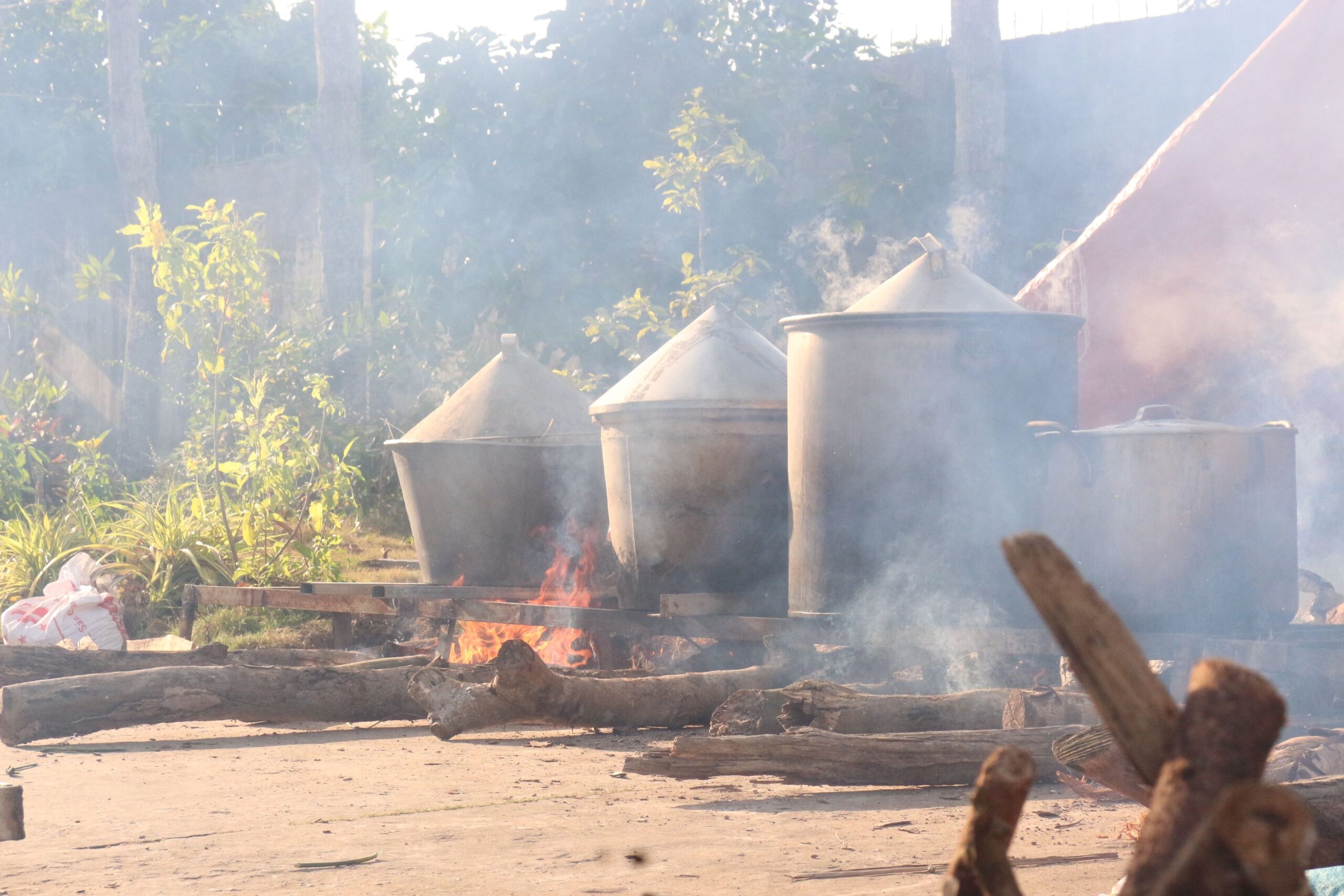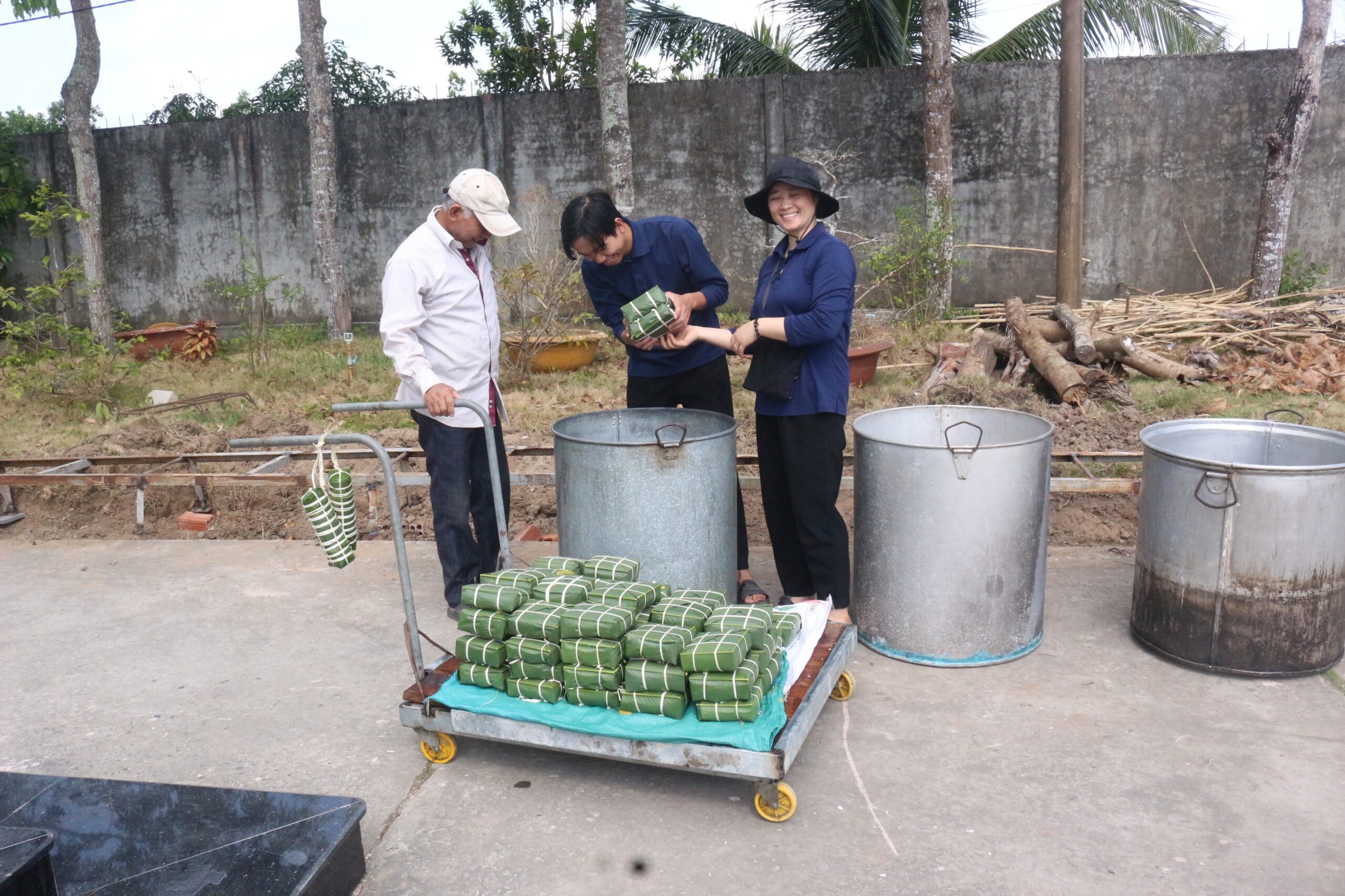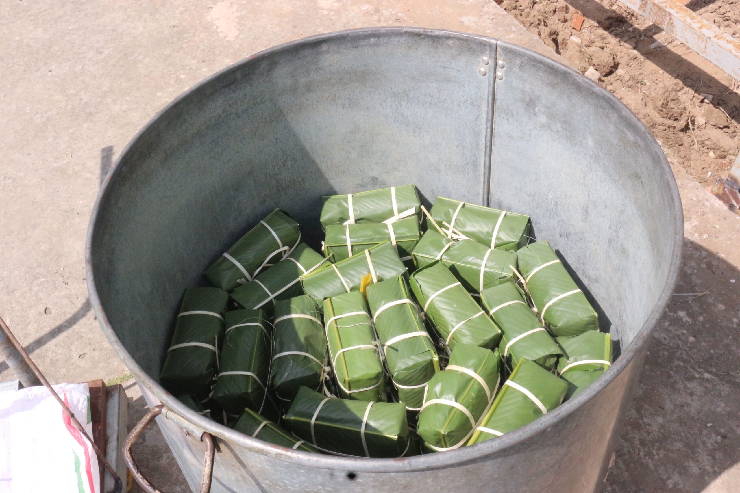 Đến khoảng trưa, những nồi bánh đầu tiên được đặt lên bếp lửa ấm áp. Sau bữa trưa ngắn, các công đoạn tiếp tục diễn ra nhịp nhàng và đều đặn.